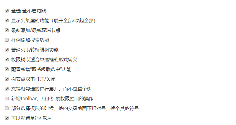 });至此,一个最基础的权限树就已经完成了,如果想实现演示GIF内的各种扩展功能,请继续往下看,并参考源码